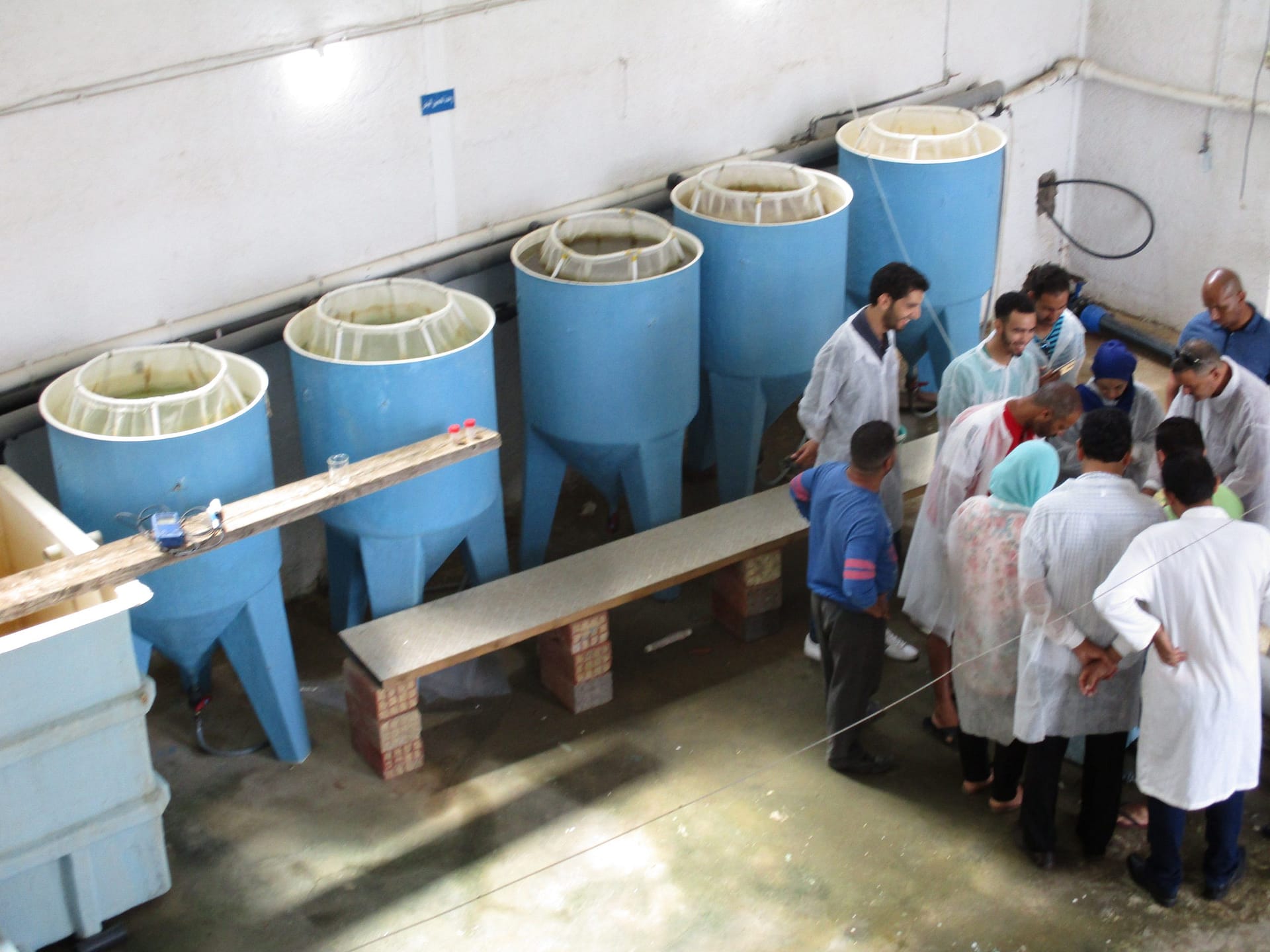 • Une salle de production du zooplancton (principalement les rotifères). Elle comprend 4 bassins cylindro-coniques de 150 litres chacun et un système d’arrivée d’air comprimé, d’oxygène pur et d’eau filtrée.